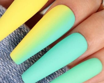 Nails can be attached using double sided adhesive nail tabs or nail glue (glue/adhesive not included). I will have available to sell very soon! Limited time sale easy return. The color combo is stunning, and pastel blue compliments yellow perfectly. To create the gradient effect, you may need a sponge and at least three color nail polishes.